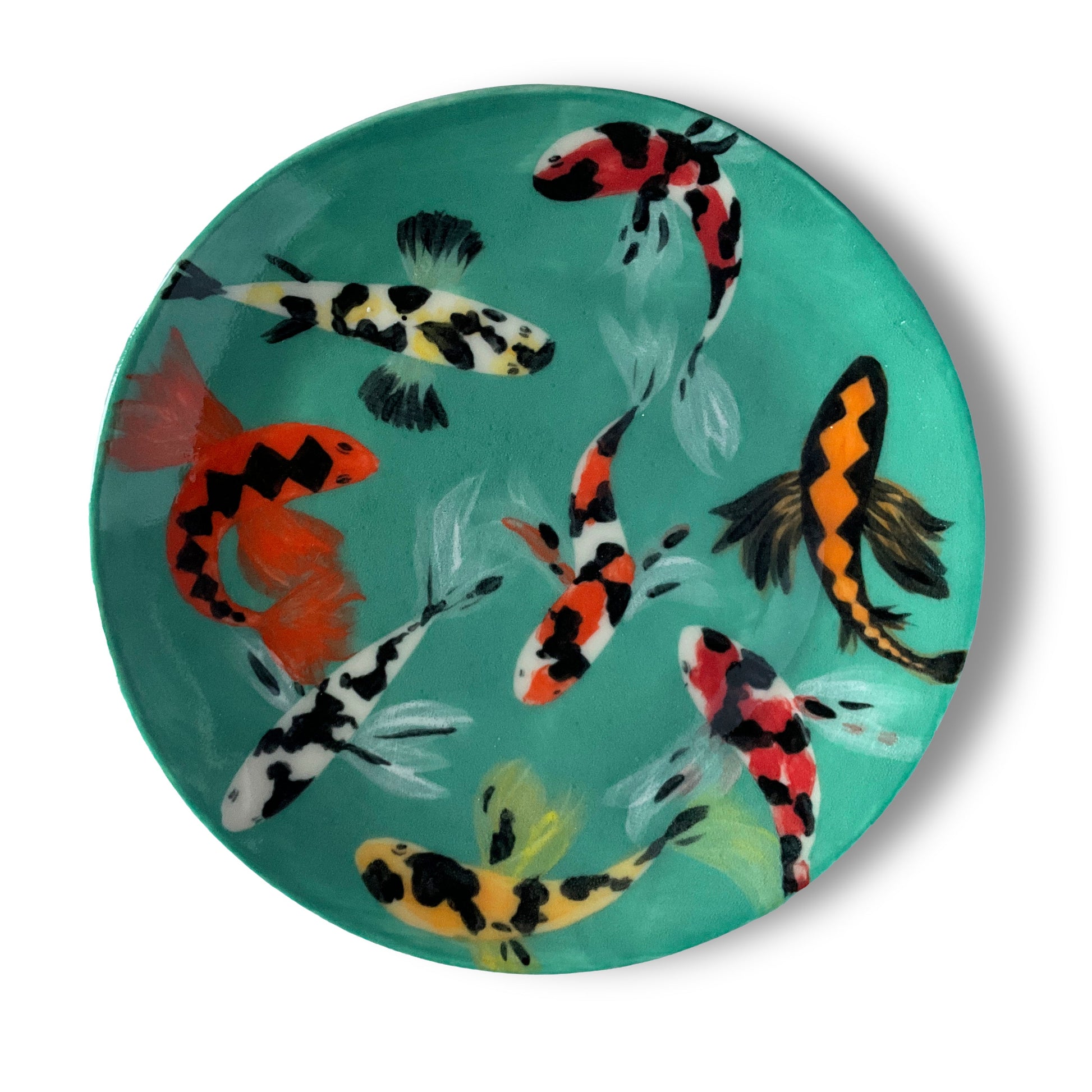 Made from stoneware clay and painted with a range of blue slips and vibrant underglazes, I wanted to capture the dynamic movement of Koi carp in a way that almost makes them appear to swim across the surface. Enjoy it as a decorative object or as a side plate. It is food and dishwasher safe.