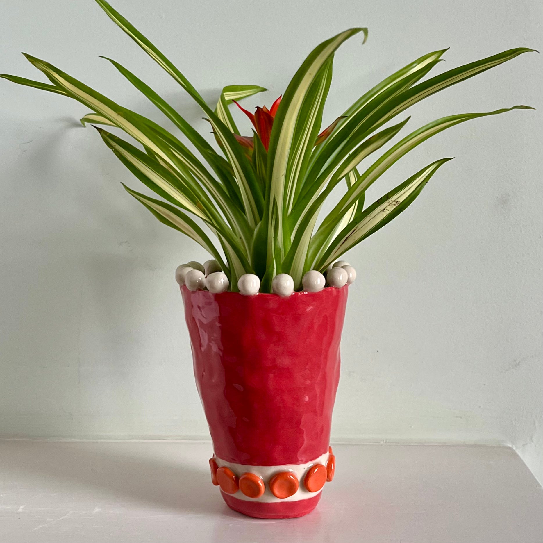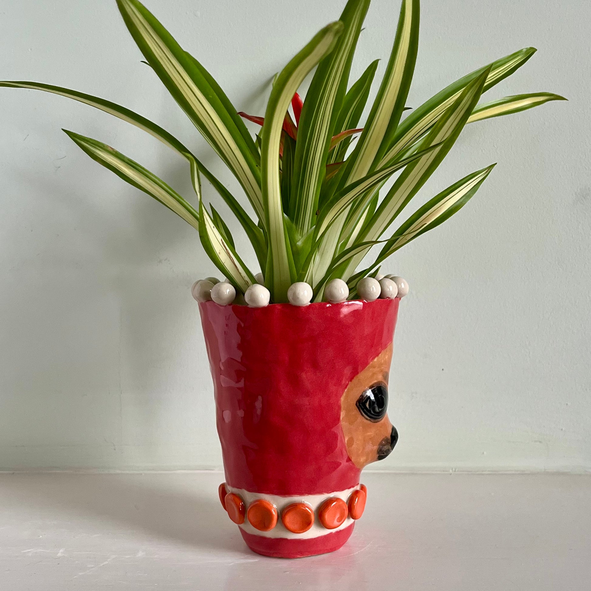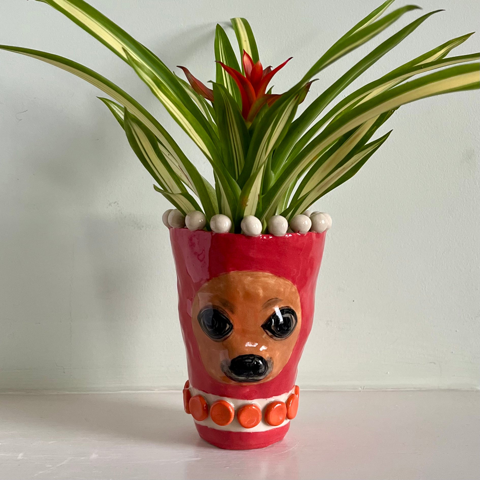 This ornamental head pot stands at 12cm. Made from stoneware clay it has been hand made and decorated using coloured slips and underglazes. The final glaze firing ensures the pot is water retentive making it ideal for small indoor plants, pencils and dog treats!