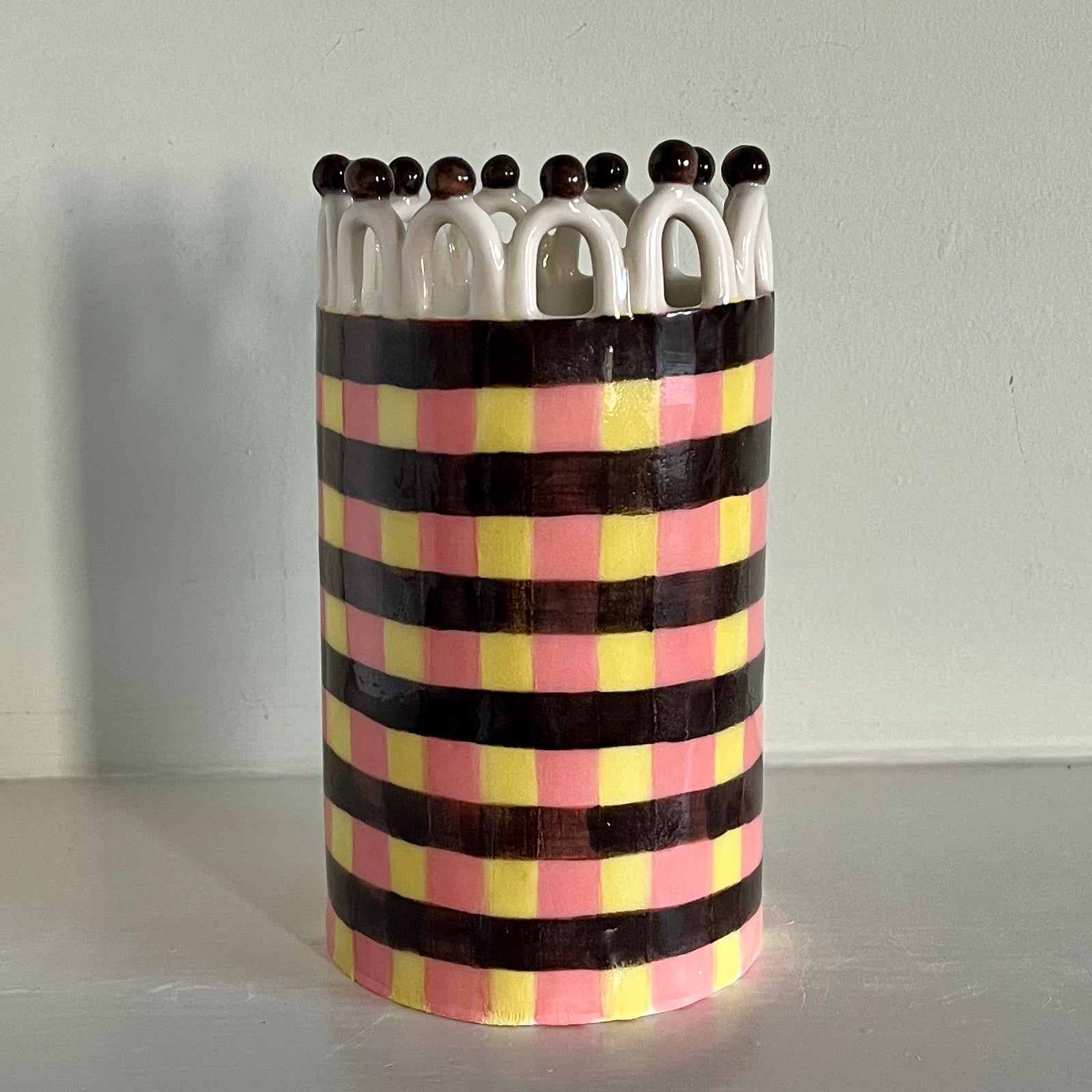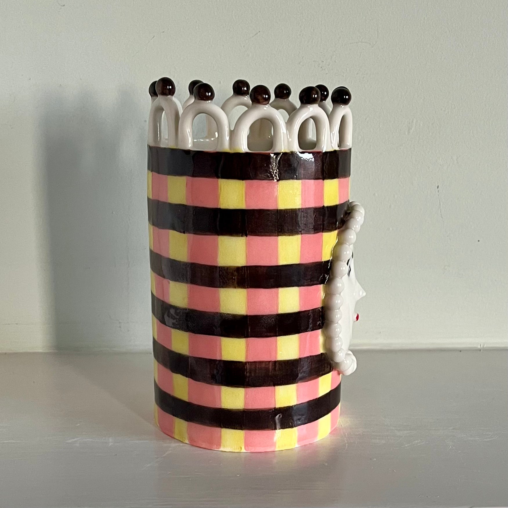 This ornamental head pot stands at 15.5cm to the top of its white looped crown. Made from porcelain clay it has been hand made and decorated using slips and underglazes. The final glaze firing ensures the pot is water retentive making it ideal for short stemmed flowers.