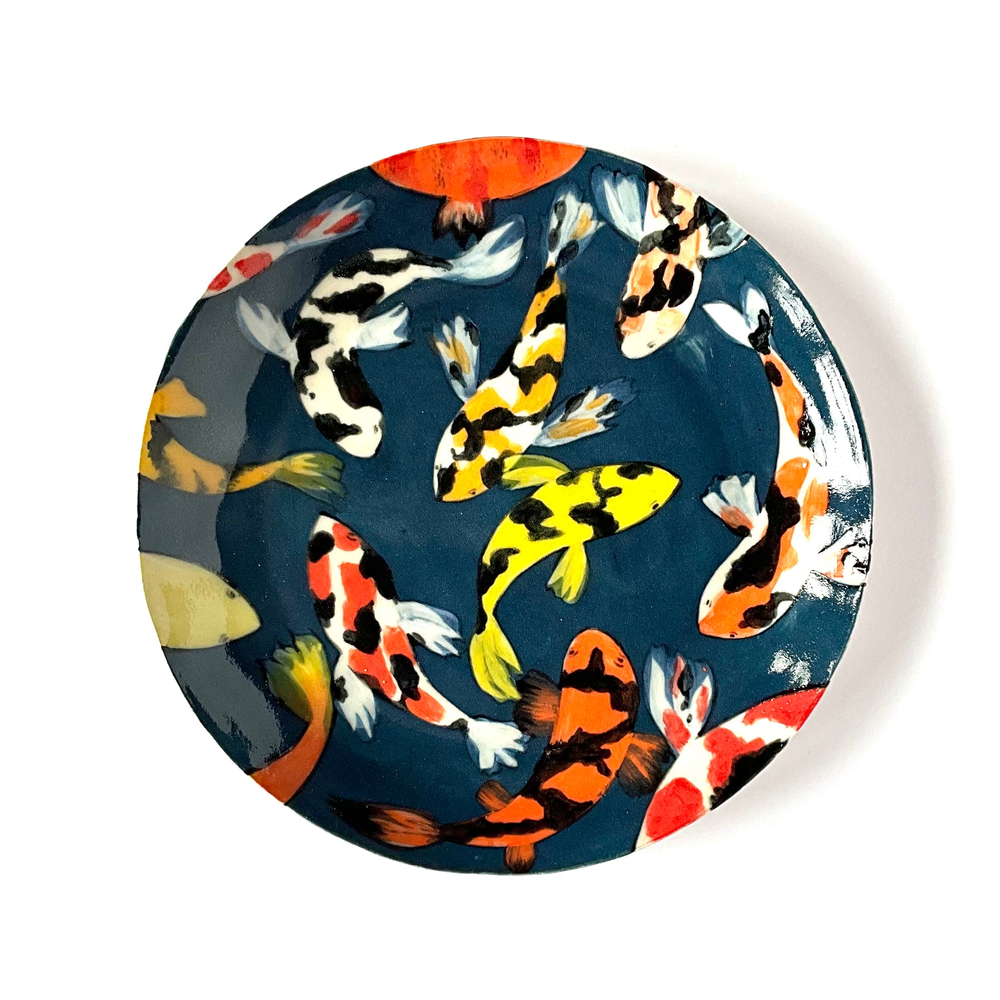 Made from stoneware clay and painted with a range of blue slips and vibrant underglazes, I wanted to capture the dynamic movement of Koi carp in a way that almost makes them appear to swim across the surface. Enjoy it as a decorative object or as a side plate. It is food and dishwasher safe.