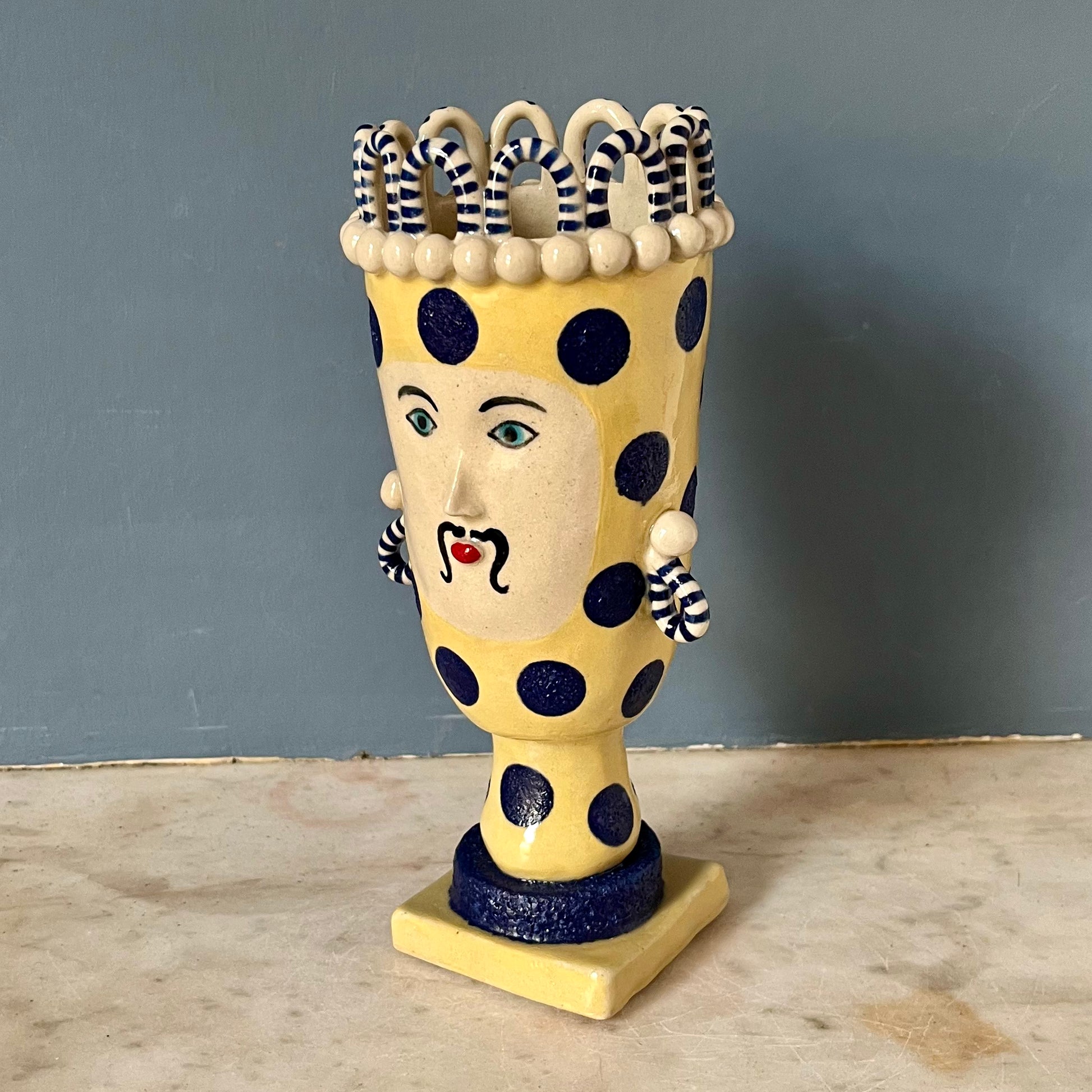 Honeydew Yellow with Blue Spots, Moustache, Stripy Looped Earrings and Crown