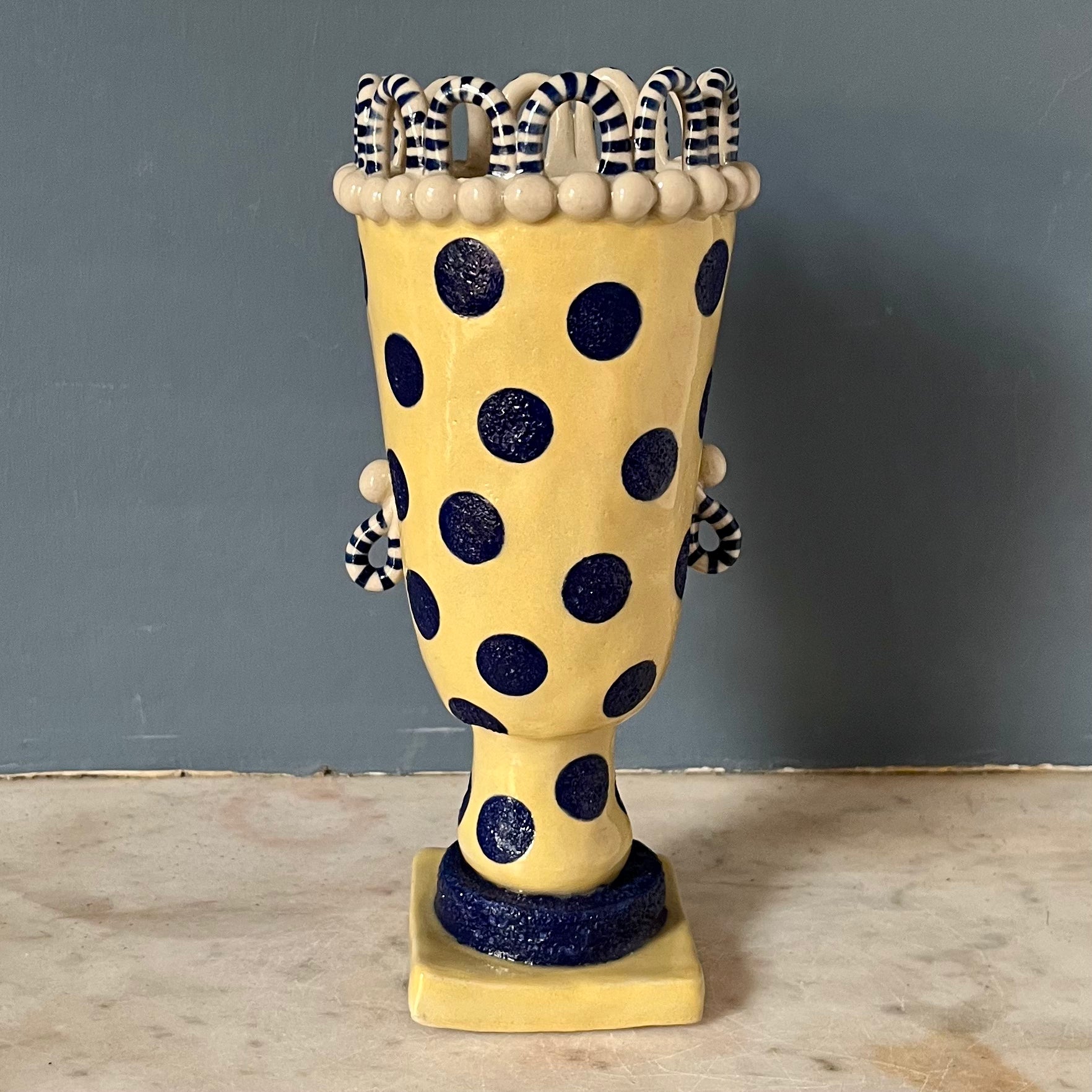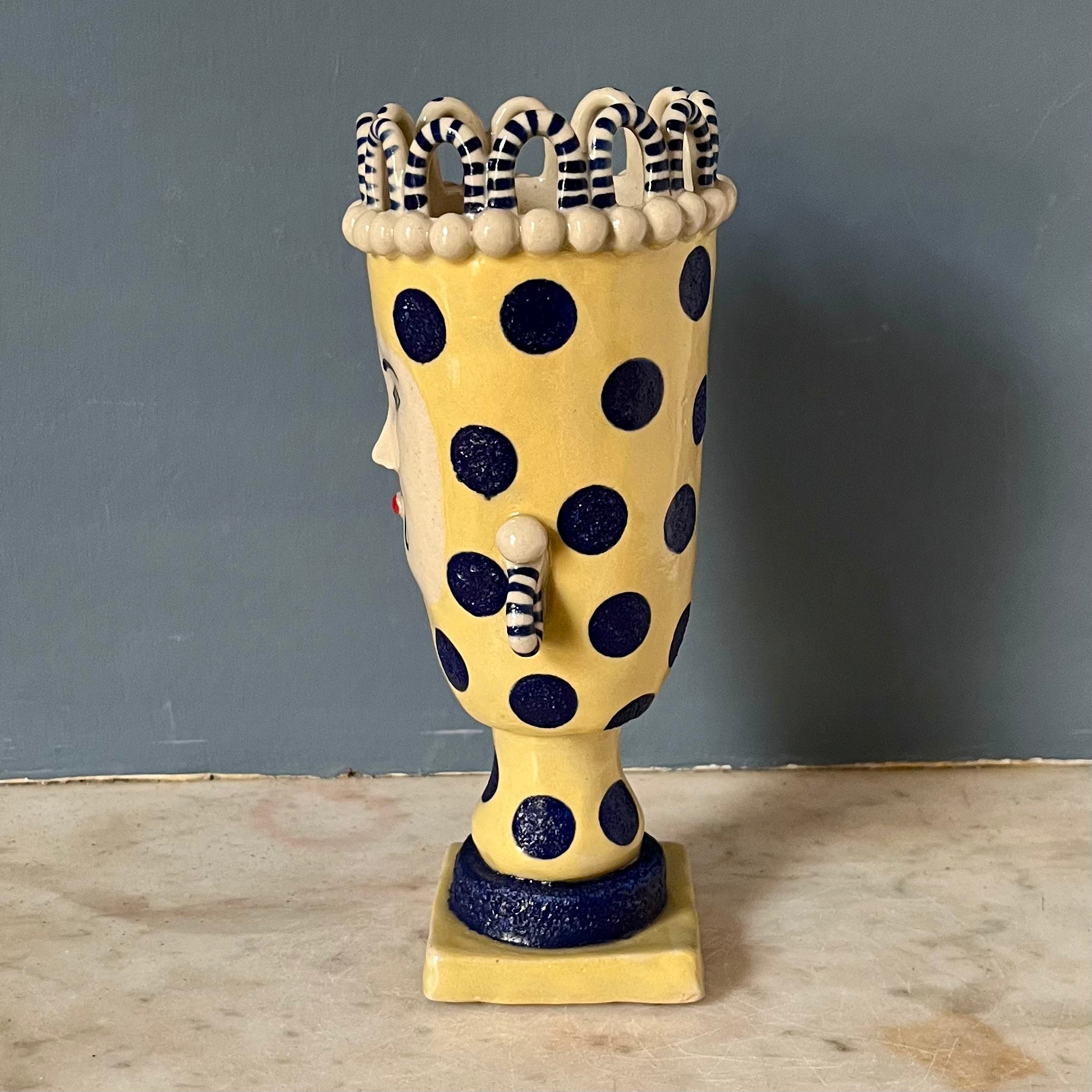 This ornamental head pot stands at 19cm to the top of its stripy white looped crown. Made from stoneware clay it has been hand made and decorated using slips and underglazes. The final glaze firing ensures the pot is water retentive making it ideal for flowers.