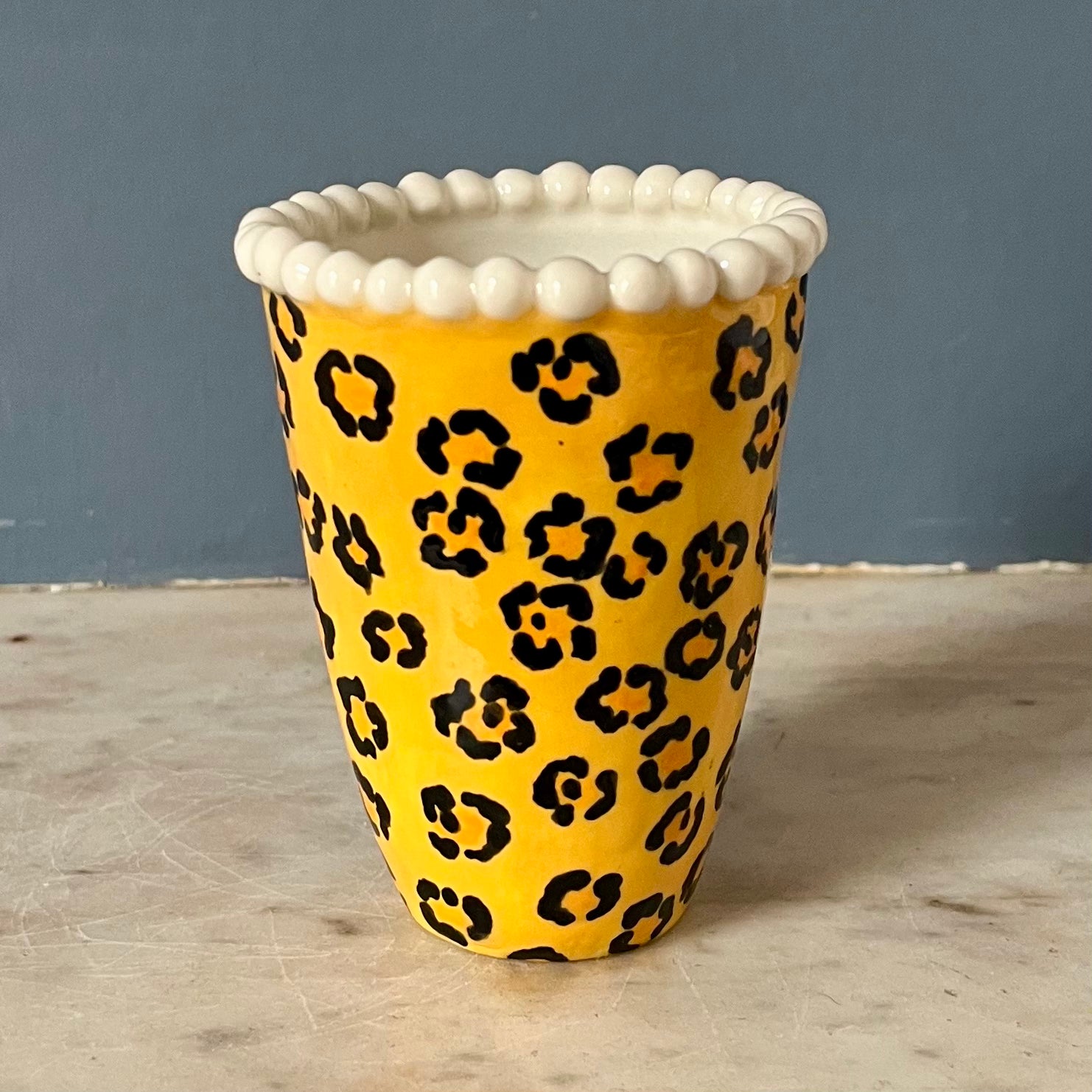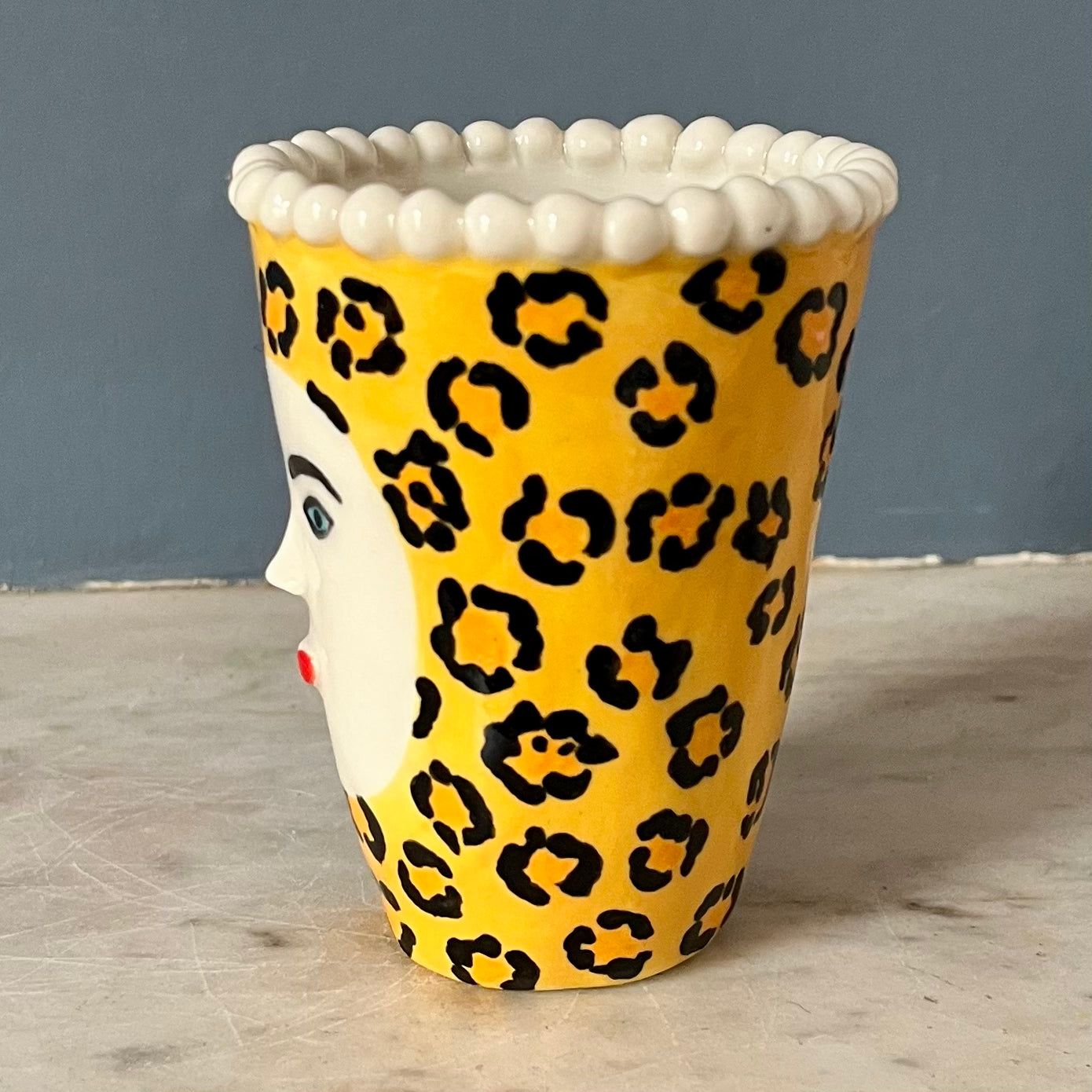 This ornamental head pot stands at 9cm to the top of its white pearl crown. Made from porcelain clay it has been hand made and decorated using slip and underglazes. The final glaze firing ensures the pot is water retentive making it ideal for very short stemmed flowers.