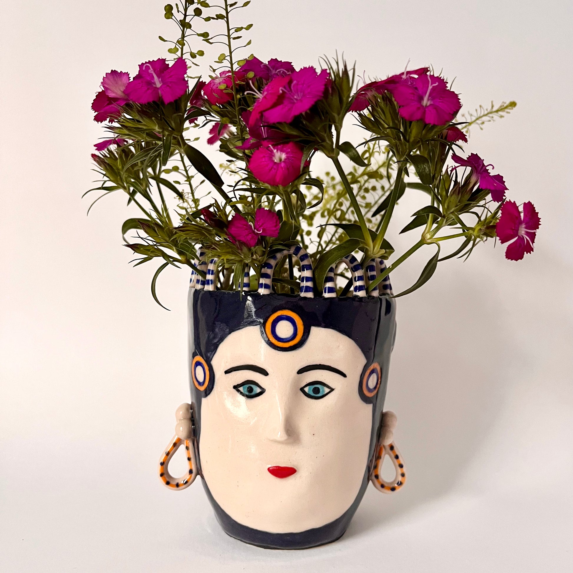 This ornamental head pot measures 12cm to the top of its navy and white stripy looped crown. Made from stoneware clay it has been hand decorated using coloured slips and underglazes. The final glaze firing ensures the pot is water retentive making it ideal for small plants or very short stemmed cut flowers.