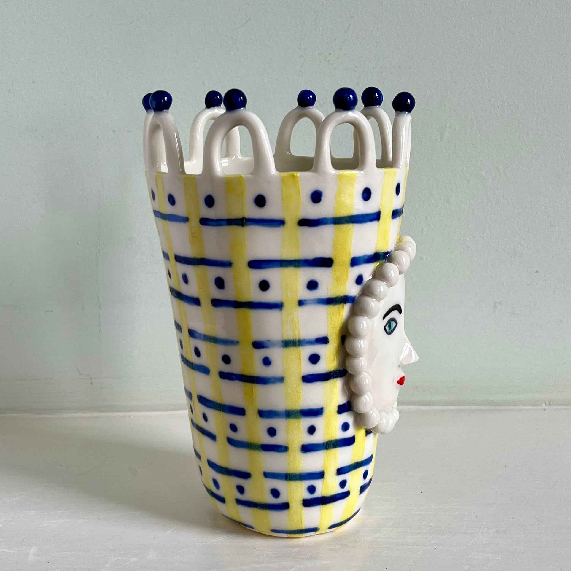 This ornamental head pot stands at 15cm to the top of its white looped crown. Made from porcelain clay it has been hand made and decorated using blue underglaze. The final glaze firing ensures the pot is water retentive making it ideal for short stemmed flowers.