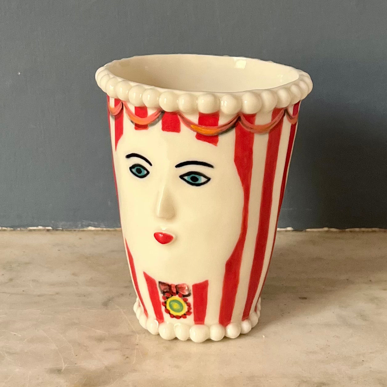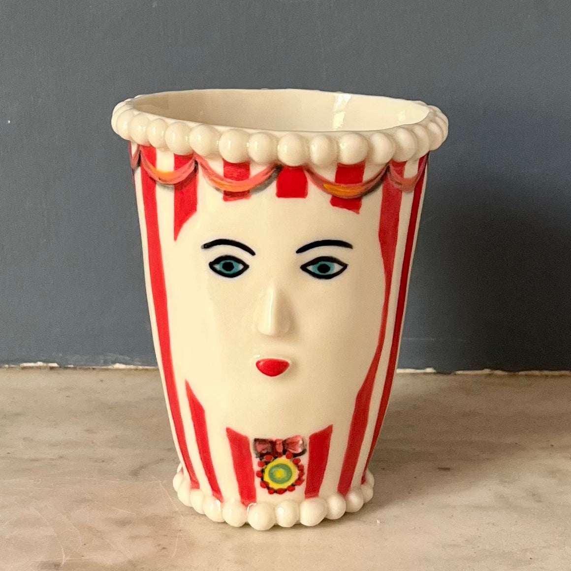 This ornamental head pot stands at 9cm to the top of its white pearl crown. Made from porcelain clay it has been hand made and decorated using underglazes. The final glaze firing ensures the pot is water retentive making it ideal for short stemmed flowers.