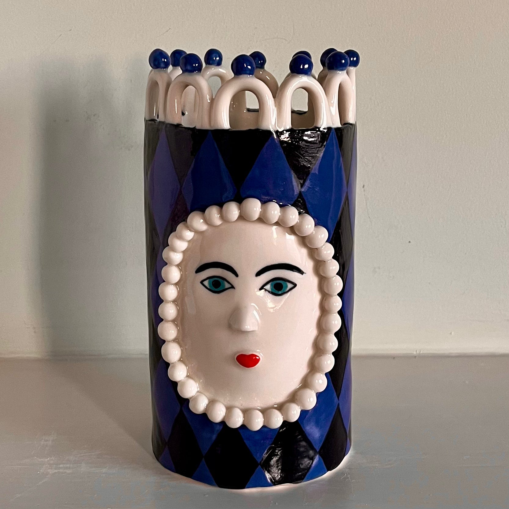 This ornamental head pot stands at 17cm to the top of its white looped crown. Made from porcelain clay it has been hand made and decorated using slips and underglazes. The final glaze firing ensures the pot is water retentive making it ideal for short stemmed flowers.