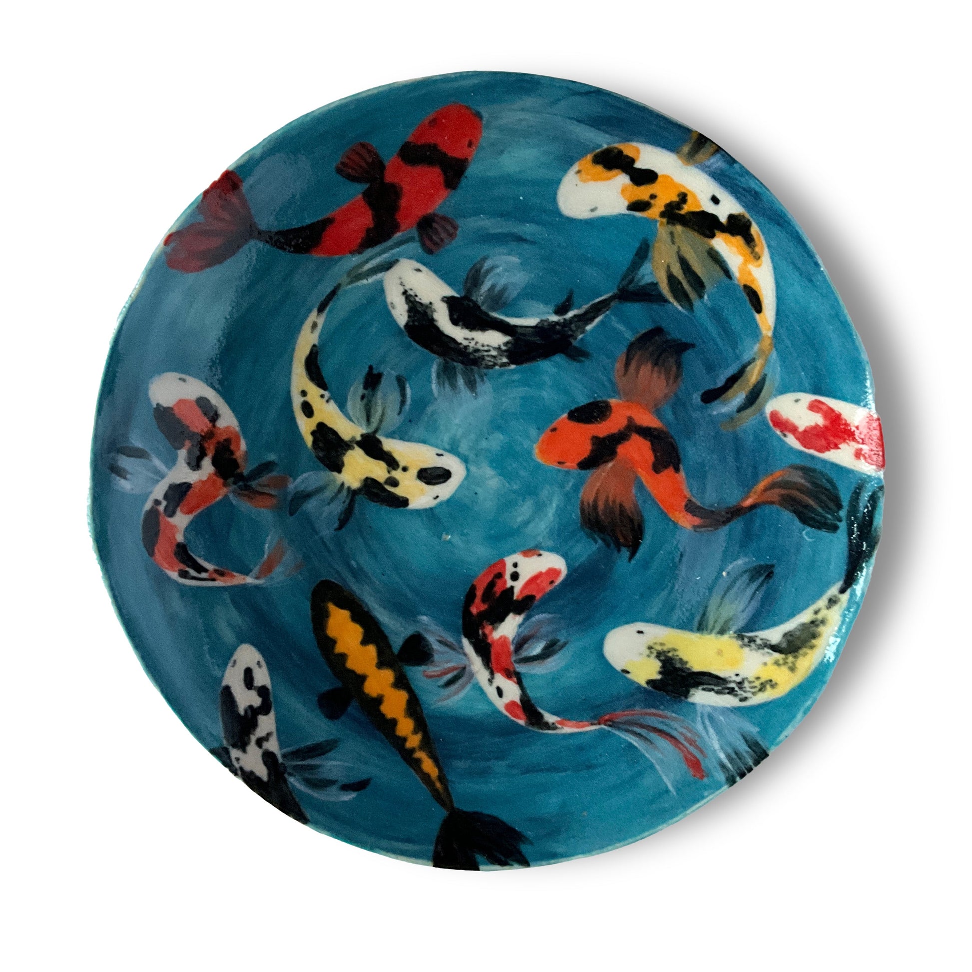 Made from stoneware clay and painted with a range of blue slips and vibrant underglazes, I wanted to capture the dynamic movement of Koi carp in a way that almost makes them appear to swim across the surface. Enjoy it as a decorative object or as a side plate. It is food and dishwasher safe.