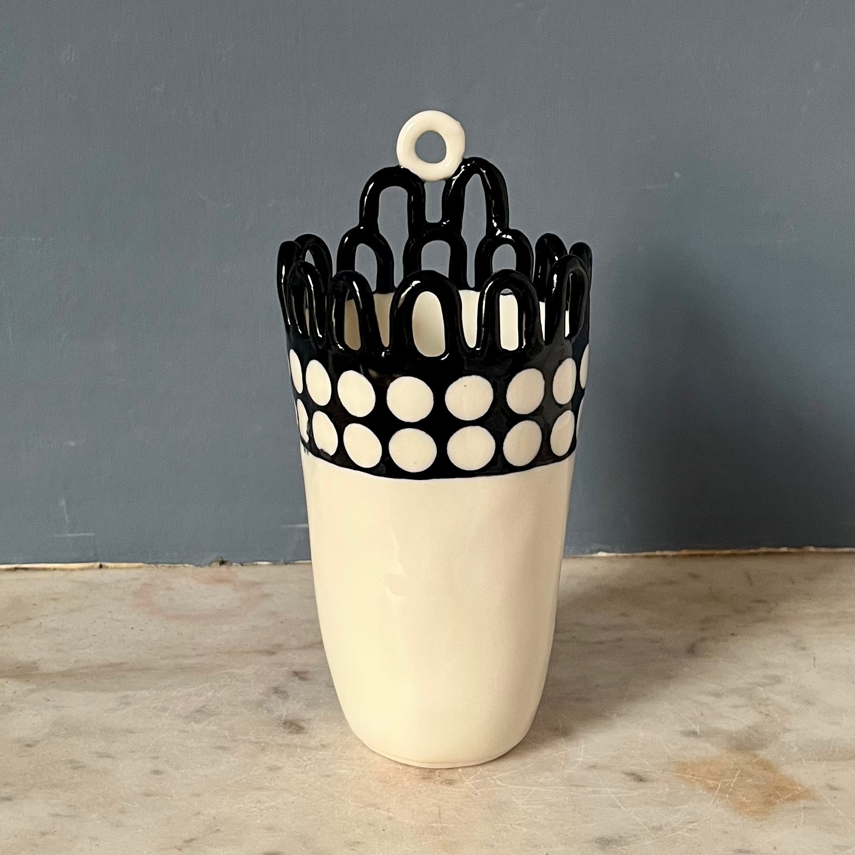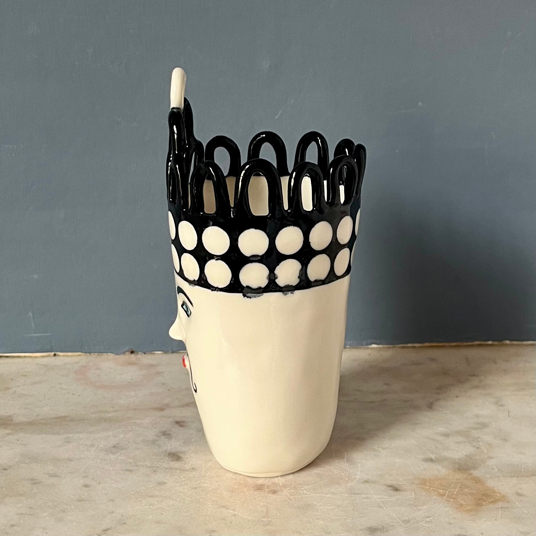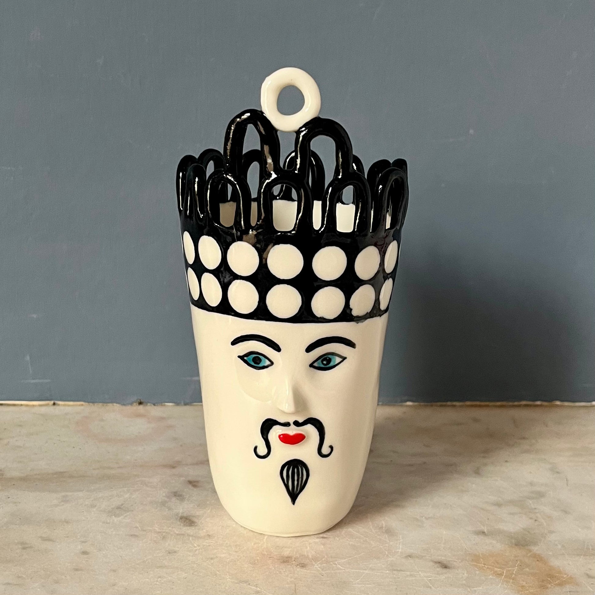 This ornamental head pot stands 15cm to the top of the polo mint on its crown. Hand made from porcelain clay and decorated using coloured underglazes. The final glaze firing ensures the pot is water retentive making it ideal for short stemmed cut flowers.