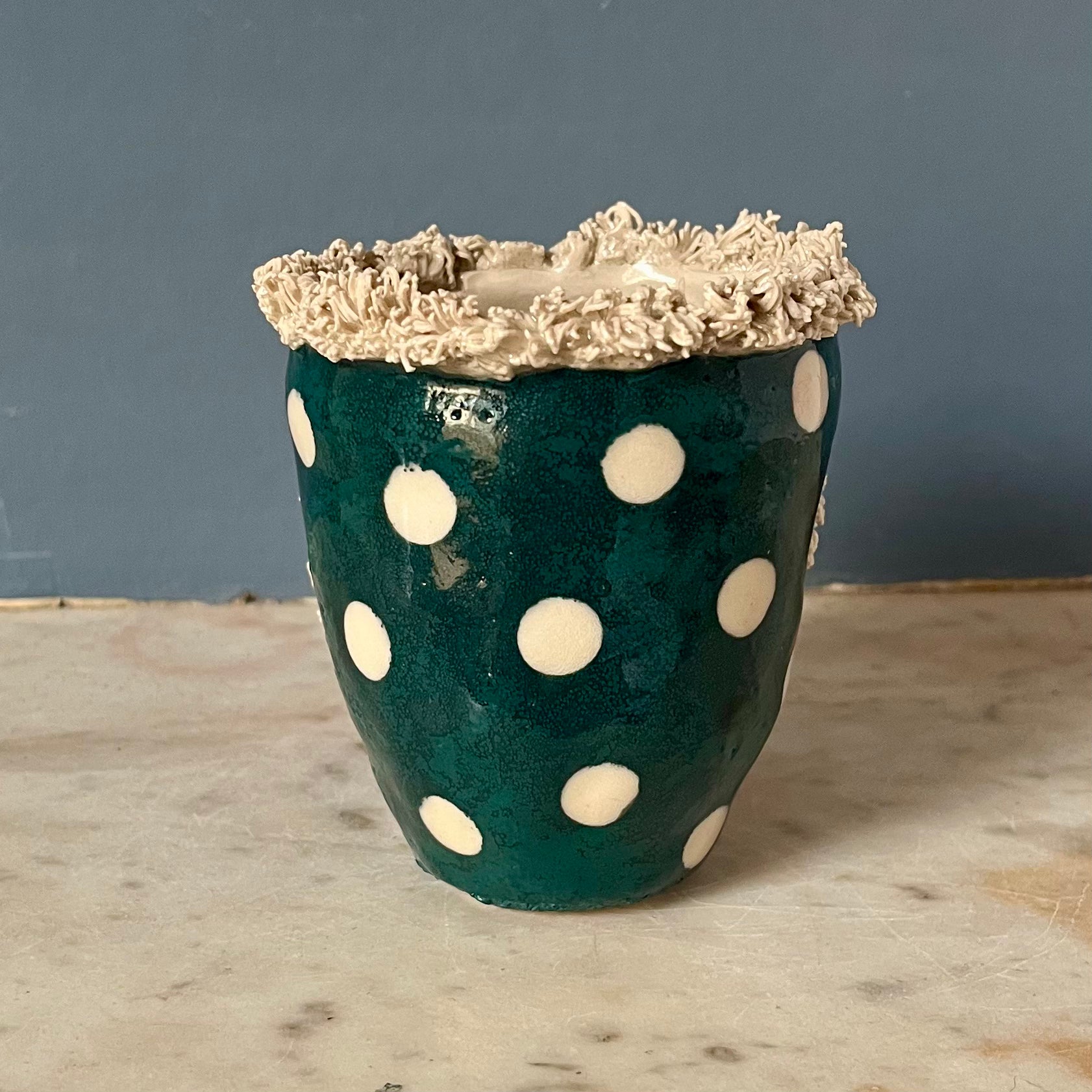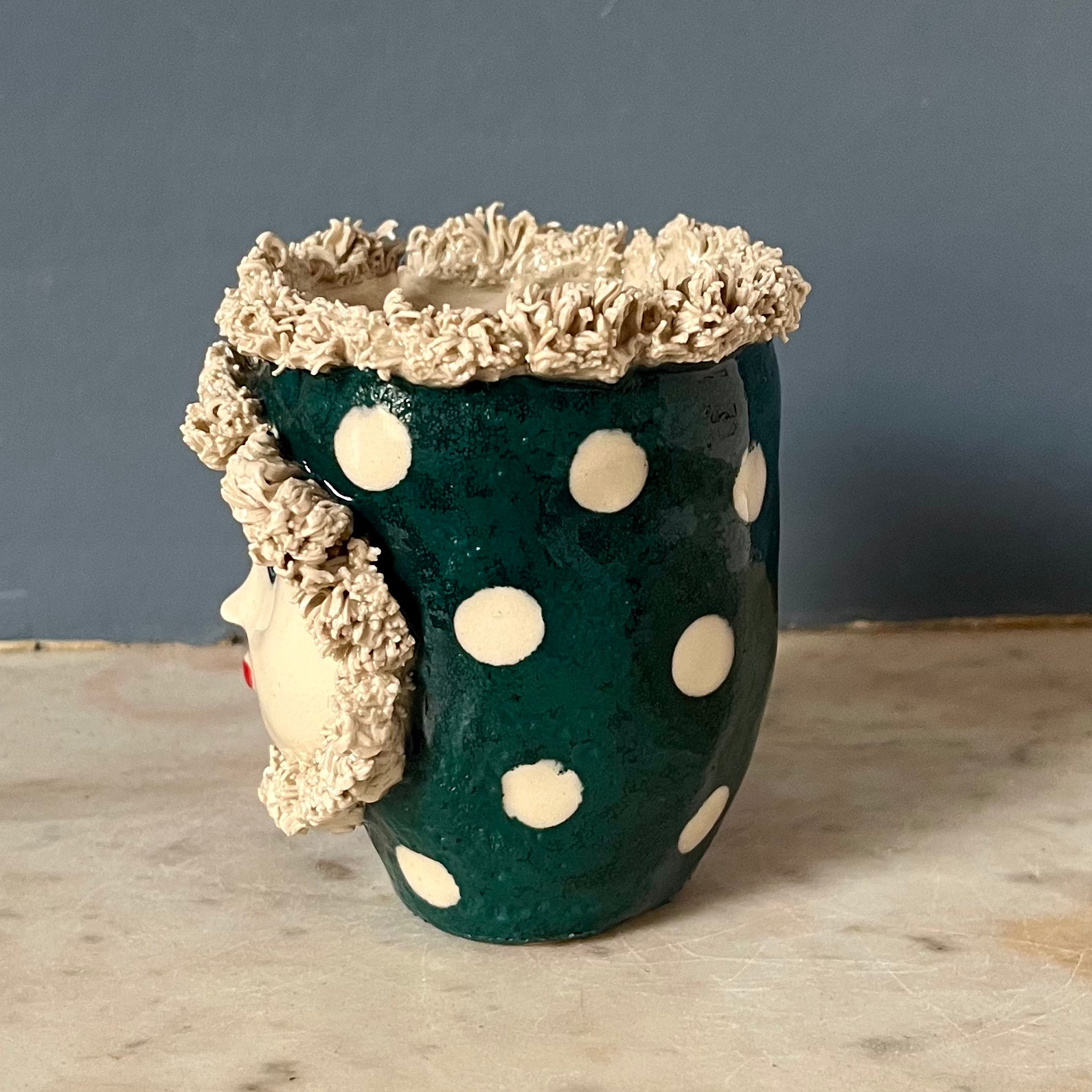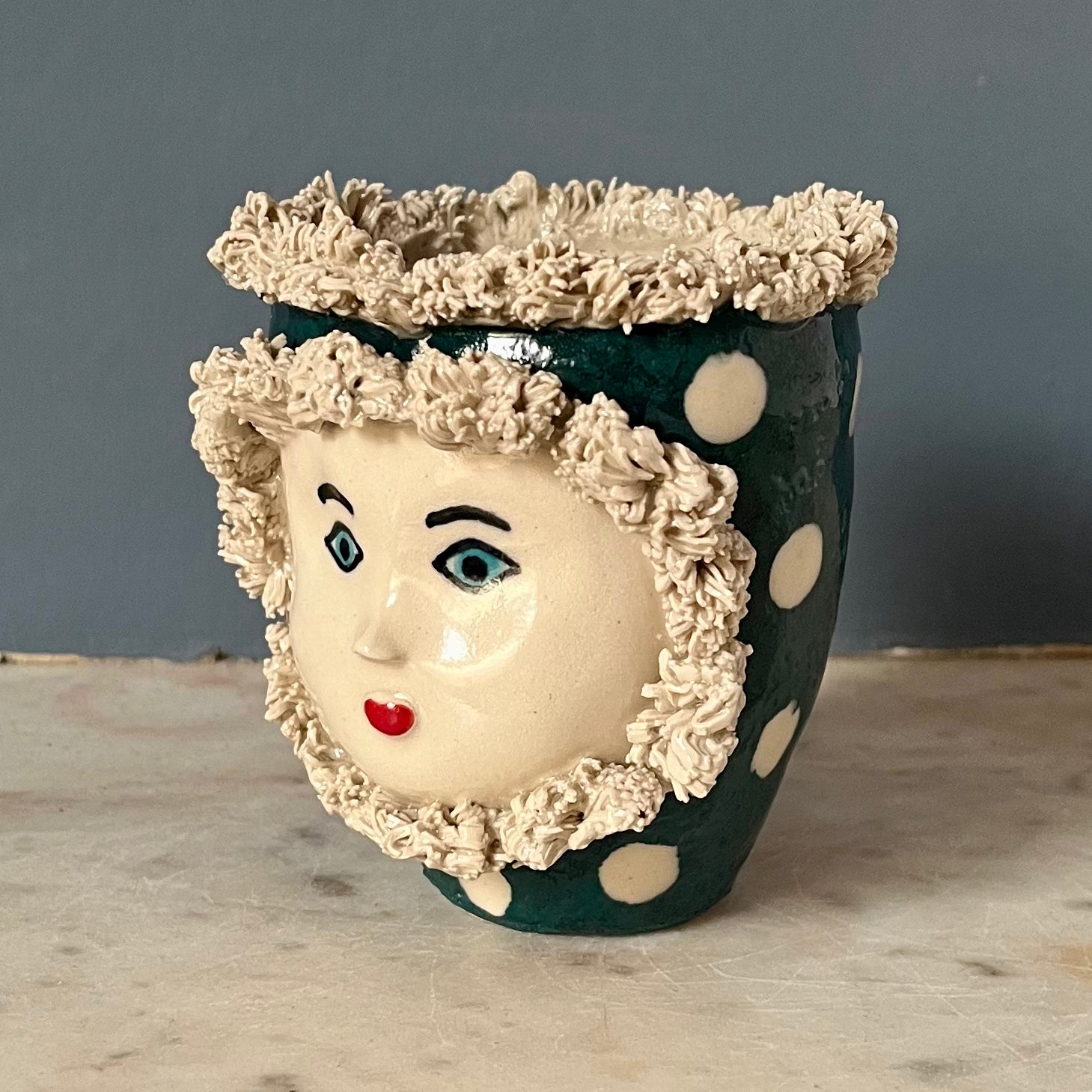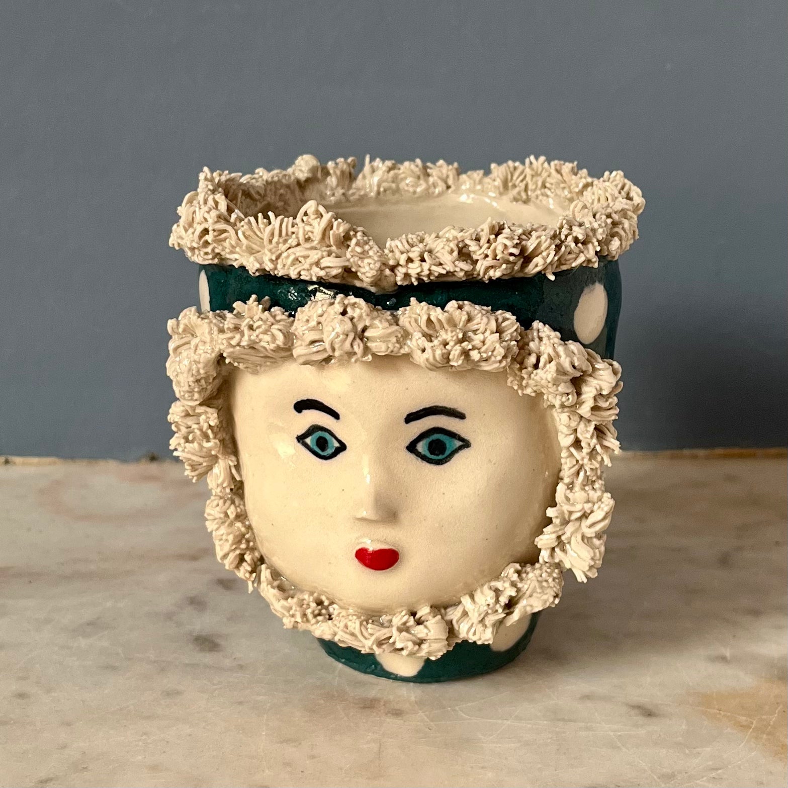 This ornamental head pot stands at 9cm to the top of its white fur crown. Made from stoneware clay it has been hand made and decorated using slip and underglazes. The final glaze firing ensures the pot is water retentive making it ideal for very short stemmed flowers.