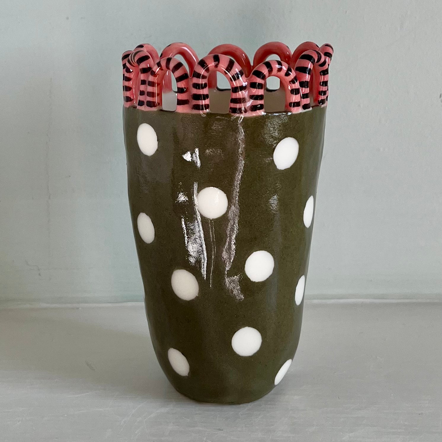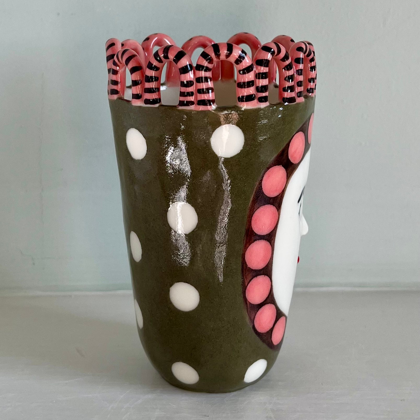 This ornamental head pot stands 12.5cm to the top of its stripy hooped crown. Hand made from porcelain clay and decorated using coloured slips and underglazes. The final glaze firing ensures the pot is water retentive making it ideal for short stemmed cut flowers.